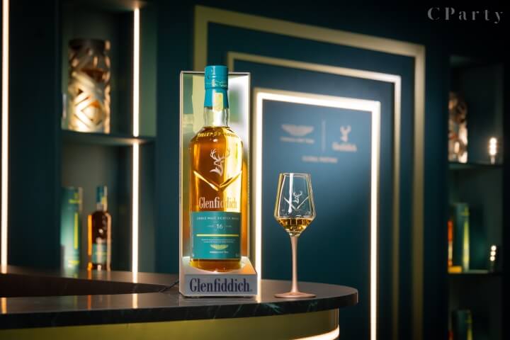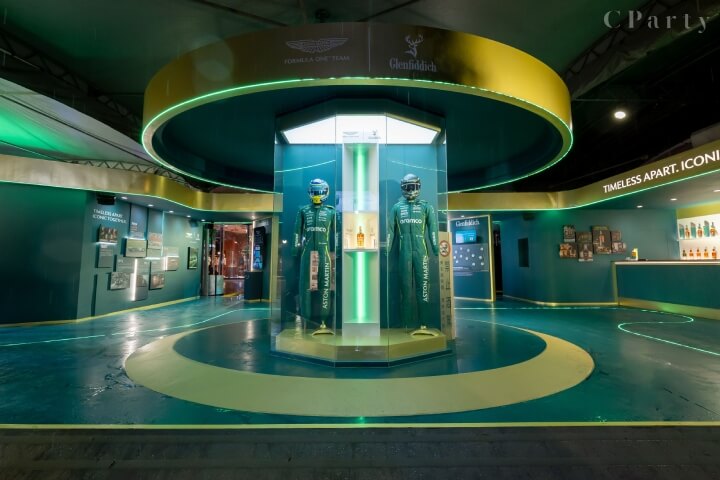 空間以「英倫綠×紳士金」為主調,象徵性強且內涵深厚,呼應賽車塗裝與威士忌金液的光澤。整體氛圍講求節奏與平衡,從入口、展陳到品飲體驗,皆以「時間與速度的對話」為軸線,讓參觀者在沉浸空間中感受格蘭菲迪的深度與 Aston Martin的動能,體現兩大品牌跨越領域的工藝共鳴。