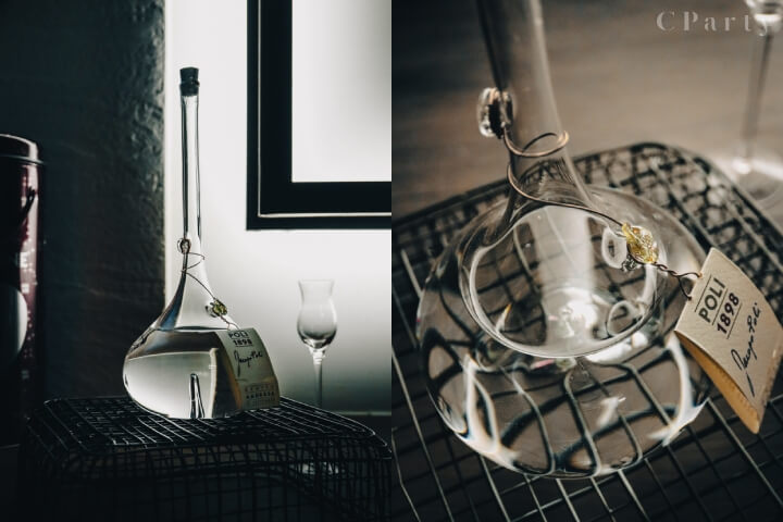 無過桶的「九⽉的愛 義式渣釀⽩蘭地(Amorosa di Settembre)」以義大利Vespaiolo白葡萄進行蒸餾,打造出飽滿奔放的香氣,如新鮮杏桃、綠蘋果、梨子、花香芬芳,酒體優雅細緻、口感輕盈柔和,堪稱香水等級酒品,並盛裝於蒸餾器為概念精心設計的手工吹製玻璃瓶身內,搭配纏繞銅絲,彰顯其非凡的年輕氣息,相當受到女性族群的喜愛。