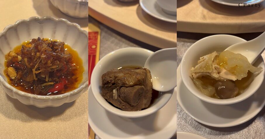 在現代的飲食取向上,學生團隊也下足功夫:像是「黑蒜佛跳牆」利用黑蒜自然的甘醇,讓湯品不過份厚重,風味圓潤又富層次;「藥膳排骨鍋」不使用現成藥膳包,而是由學生親自秤量中藥材比例,調配出清爽甘美的湯頭。「金華花膠雞湯」則不添加鮮味劑、骨粉,純靠細火慢熬 8 小時,帶出自然的濃醇甜味。而「芋泥紫米糕」則因應健康趨勢,採減糖配方比例,讓長輩與孩童在年節享用美點時更無負擔。