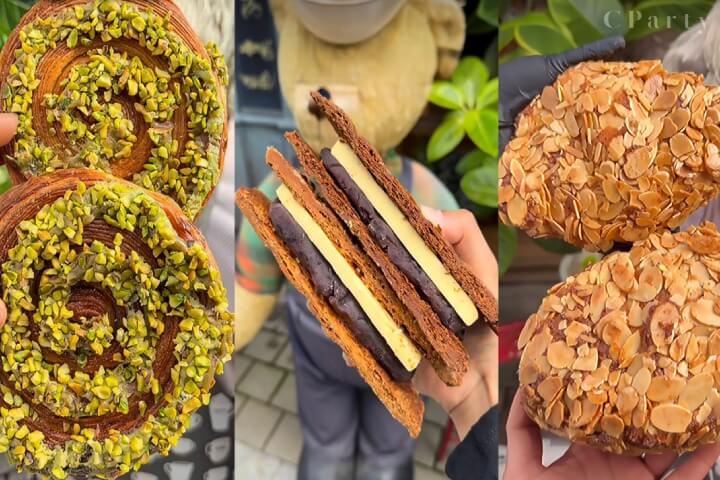 首推外型華麗的品牌人氣代表「杜拜巧克力可頌」,層層酥皮包覆濃厚堅果與巧克力內餡,切開瞬間可見餡料與麵體交織的豐富剖面,濃厚堅果油脂香與微苦可可風味相互平衡,既濃郁又不厚重,極具視覺張力的外型也成為韓國年輕族群熱愛的社群打卡款。
