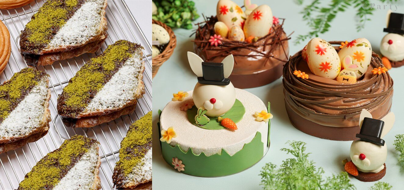 圖右為法籍甜點行政主廚羅倫設計的復活節造型甜點,「邦尼花園派對水果慕斯」以鬆軟香醇的巧克力海綿蛋糕為底,依序堆疊上巧克力脆片、柚香草莓檸檬醬和白巧克力慕斯。圖左是韓國人氣烘焙品牌Teddy Beurre House的「杜拜巧克力可頌」。(圖片來源/台北晶華酒店)